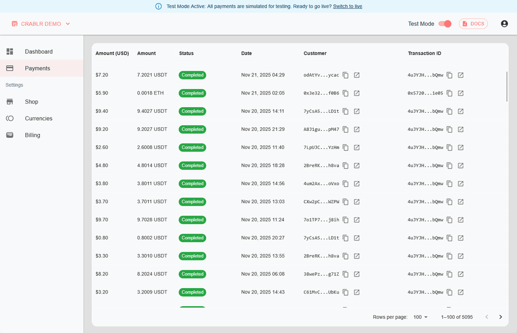 Whether you're a developer or merchant, Crablr makes accepting crypto payments straightforward and reliable.